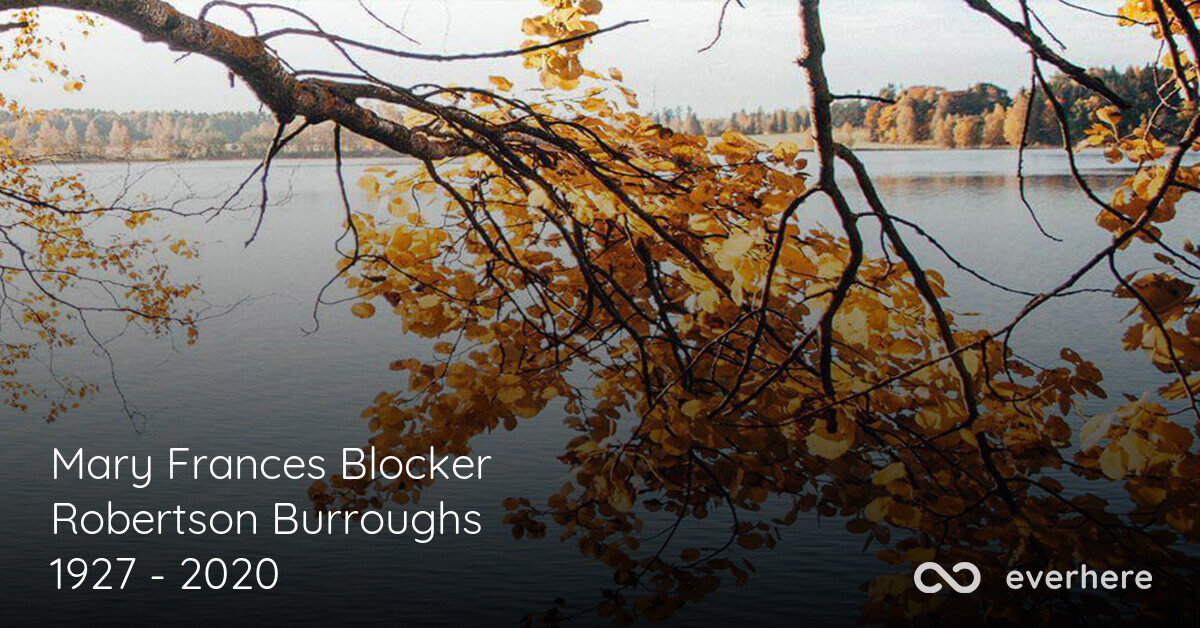 It is with deep sorrow that we announce the death of Mary Frances Blocker Robertson Burroughs (Moundville, Alabama), born in Bessemer, Alabama, who passed away on April 24, 2020, at the age of 93, leaving to mourn family and friends. Family and friends can send flowers and/or light a candle as a loving gesture for their loved one. Leave a sympathy message to the family in the guestbook on this memorial page of Mary Frances Blocker Robertson Burroughs to show support.