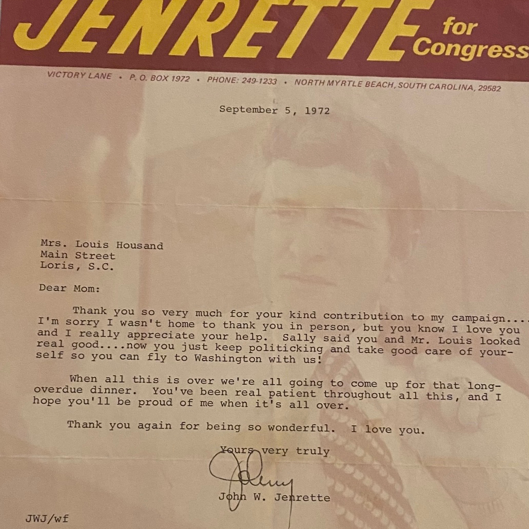 He was loved and cherished by many people including : his parents, John W. Jenrette and Mary Ellen Herring Jenrette of Loris; his sister Opal Jenrette Robertson; his wife Rosemary Long Jenrette; his son Harold Hampton “Hal”Jenrette; his daughter Elizabeth (Ralph) of Myrtle Beach, S. C.; his step-son Brooks Quickel; his step-grandchildren, McCain and Grace; and his former wives, Sally Jordan Floyd and Rita Carpenter.
